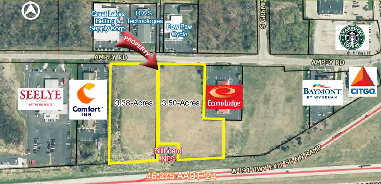 I-94 Highway Frontage For Sale – Up to 7 Acres: Excellent development opportunity in the Village of Paw Paw fronting I-94. Up to 7 acres available. The site is strategically located just off M-40/S. Kalamazoo Street with immediate access to I-94, providing exceptional visibility and convenient regional access. Surrounded by established businesses and popular destinations including St. Julian Winery, Warner Vineyards, and nearby hotels such as Comfort Inn, Econo Lodge, and Baymont by Wyndham. Zoned B-2, General Business, within the Village of Paw Paw. (Billboard on-site is excluded from the sale; easement to be in place for access and maintenance)